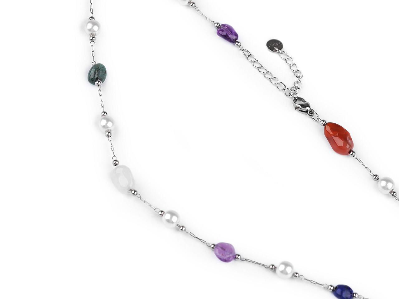 Jemný řetízkový náhrdelník z kvalitní nerezové oceli je ozdobený barevnými korálky syntetických minerálů a perlami. Korálky mají působivé průsvity, jedná se o zdařilou kopii pravých minerálů. Náhrdelník se hodí k slavnostním šatům i na běžné nošení, má velice všestranné využití.
