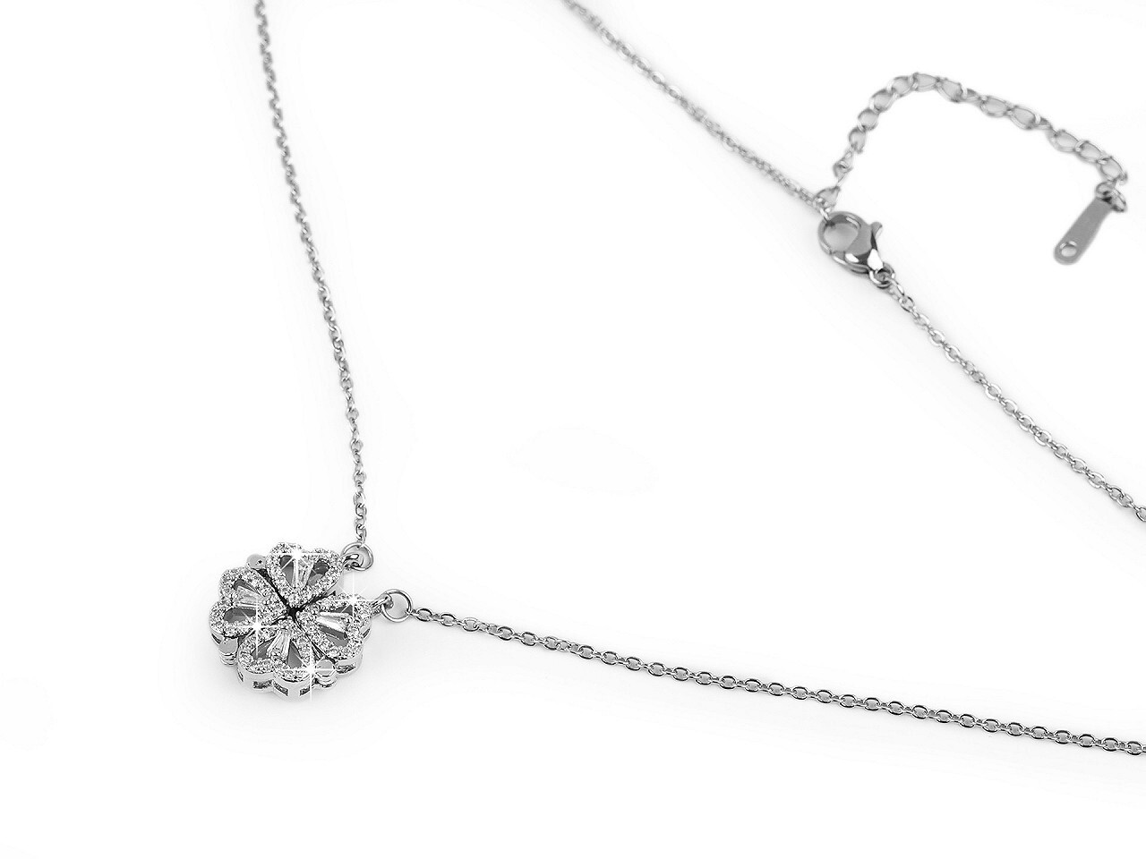 Elegantný náhrdelník s príveskom v tvare štvorlístka z kvalitnej nerezovej ocele je osadený jemne brúsenými kamienkami, ktoré dodávajú šperku žiarivý lesk. Výnimočnosť prívesku spočíva v jeho funkčnosti - jednoduchým zatiahnutím sa štvorlístok rozloží na štyri samostatné srdiečka, ktoré sú navzájom spojené magnetkami. Tie umožňujú rýchle a jednoduché zloženie späť do pôvodného tvaru, vďaka čomu je tento náhrdelník originálnym doplnkom vhodným pre rôzne príležitosti aj nálady.