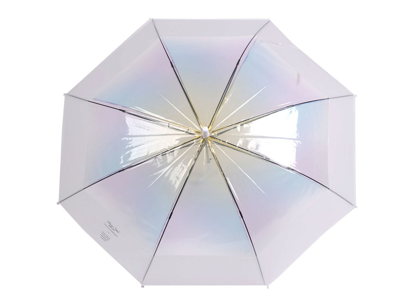 Průhledný deštník s barevným přechodem ombré bude slušet dívkám i ženám. Průhledné jsou horní 2/3 deštníku, pruh dole je bílý - průsvitný. Deštník je vystřelovací, konstrukci má z kovového drátu a pružných lamel, tvoří osm polí. Díky nim je velice pevný, neohne se ani za největšího nečasu....