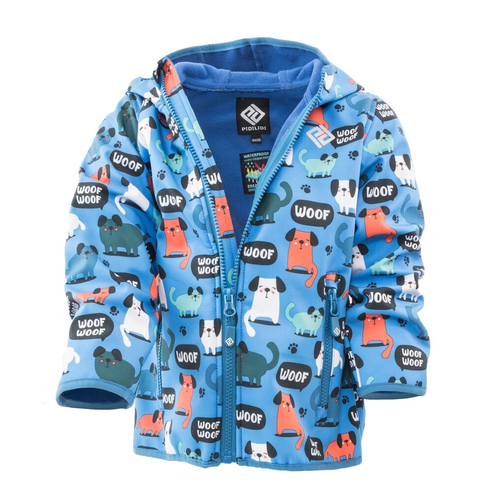 Dětská vysoce voděodolná softshellová bunda v líbivém designu. Bunda má dvě postranní kapsy opatřené zipem, pevnou kapuci a reflexní prvky na zádech a na levé přední straně.