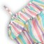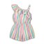 Dívčí letní overal. Barevné proužky na overalu jsou v odstínech růžové, fialové, tyrkysové a žluté. Overal má jedno úzké ramínko a jeden volánkový krátký rukáv.  prečítať celé