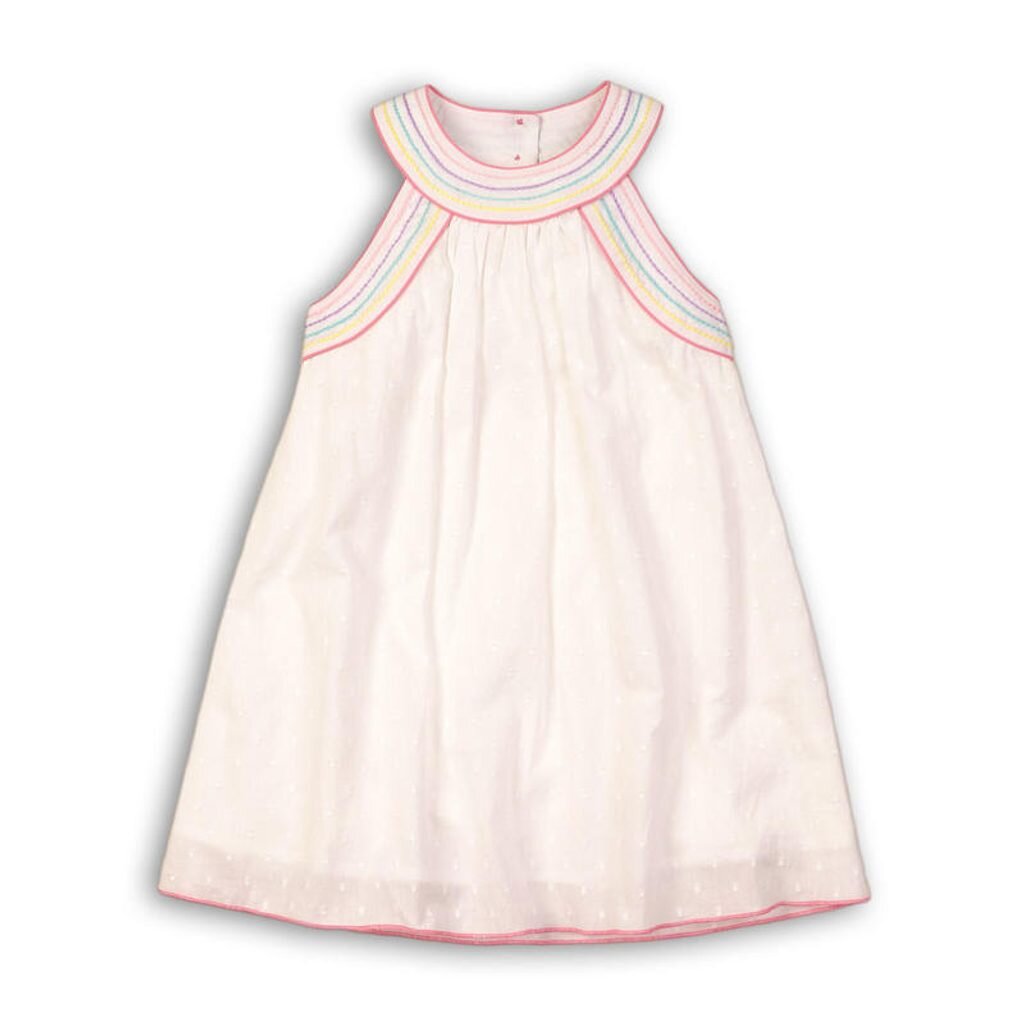Dívčí bílé bavlněné šaty bez rukávů s barevným vyšíváním kolem lemu, vzadu na knoflíky. prečítať celé