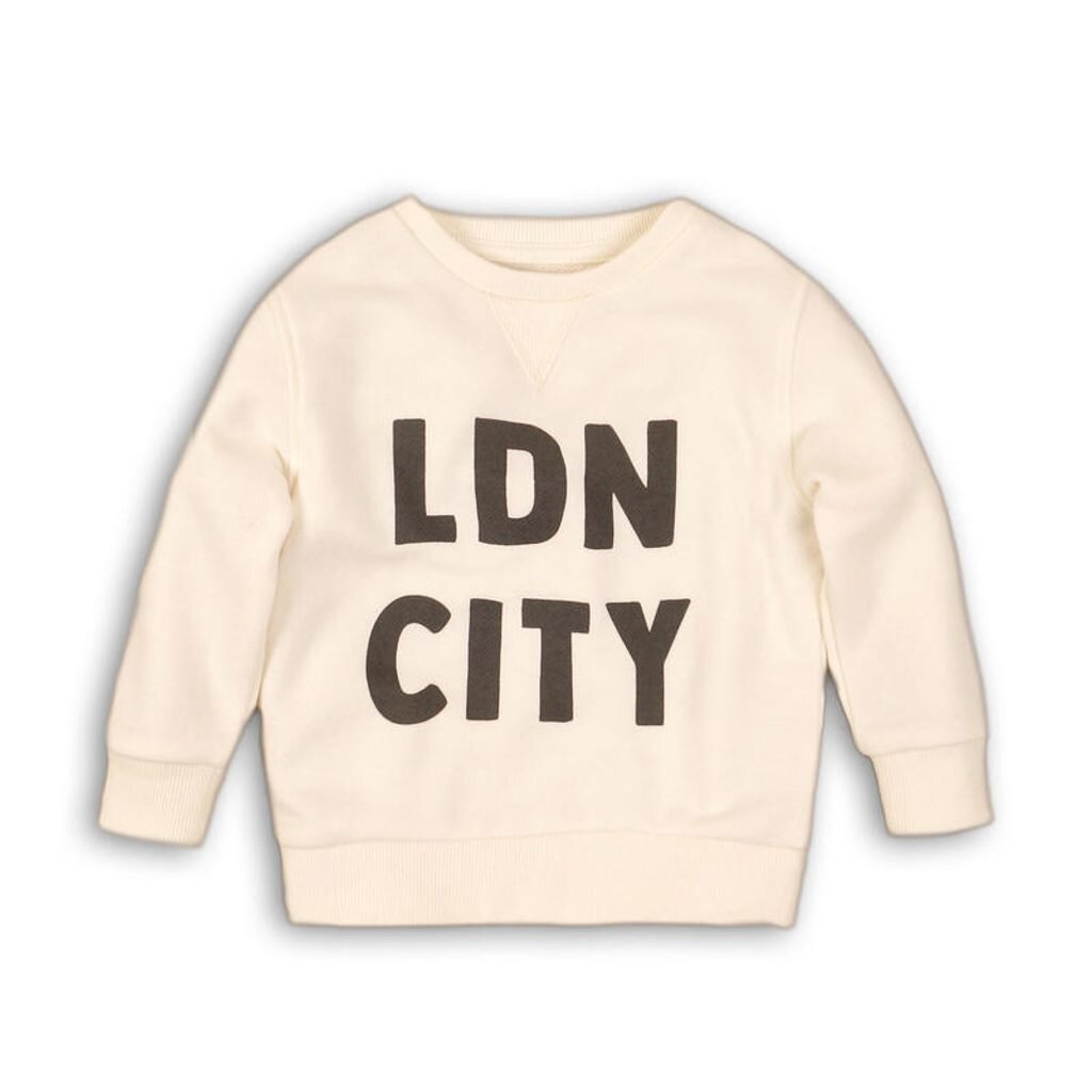 Bílá chlapecká mikina s nápisem na přední straně. prečítať celé