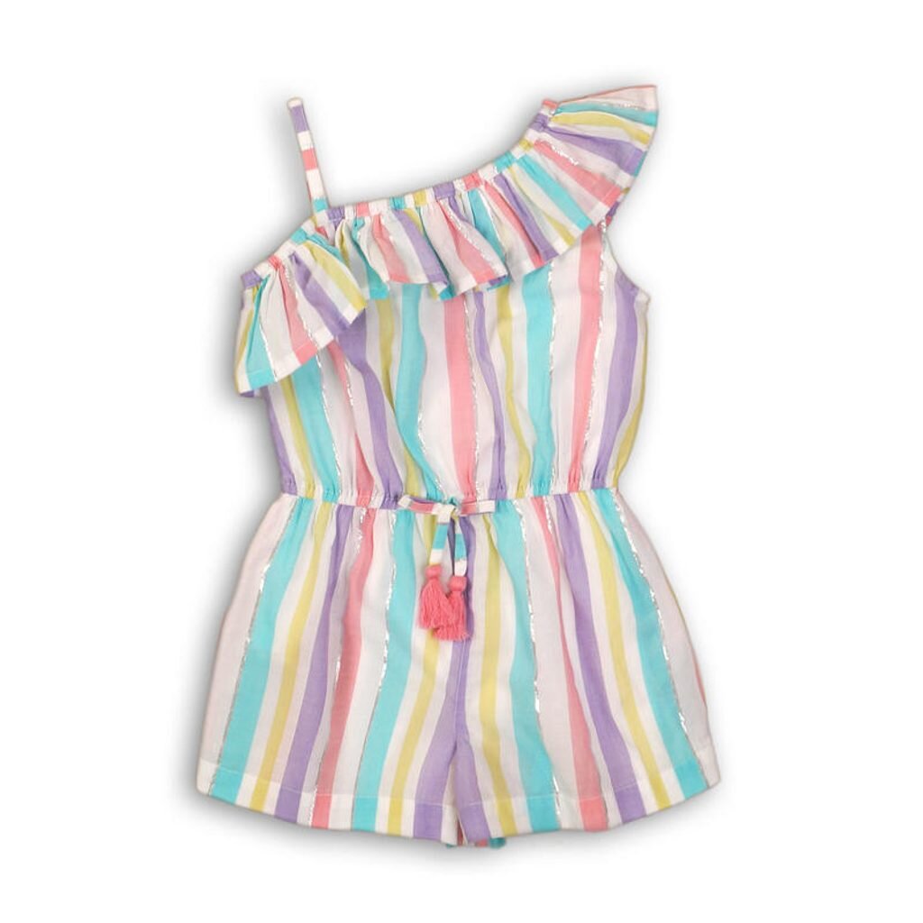 Dívčí letní overal. Barevné proužky na overalu jsou v odstínech růžové, fialové, tyrkysové a žluté. Overal má jedno úzké ramínko a jeden volánkový krátký rukáv.  prečítať celé