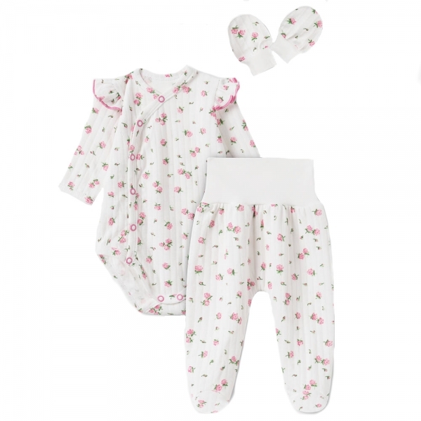 Bavlněná 3D sada, zavinovací body, polodupačky + rukavičky, Amélie, bílá/růžová; 56 (1-2m)