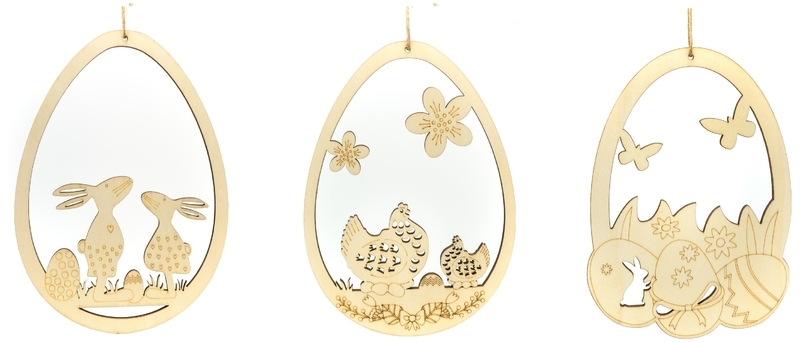 Drewniane jajka do powieszenia, . wys. 25 cm, grubość: 4,5 mm. Op. zawiera 1 szt. ze sznureczkiem o dł. 50 cm. . Dostępne 3 wzory. sp. pakowania 1/12/120 szt. prečítať celé