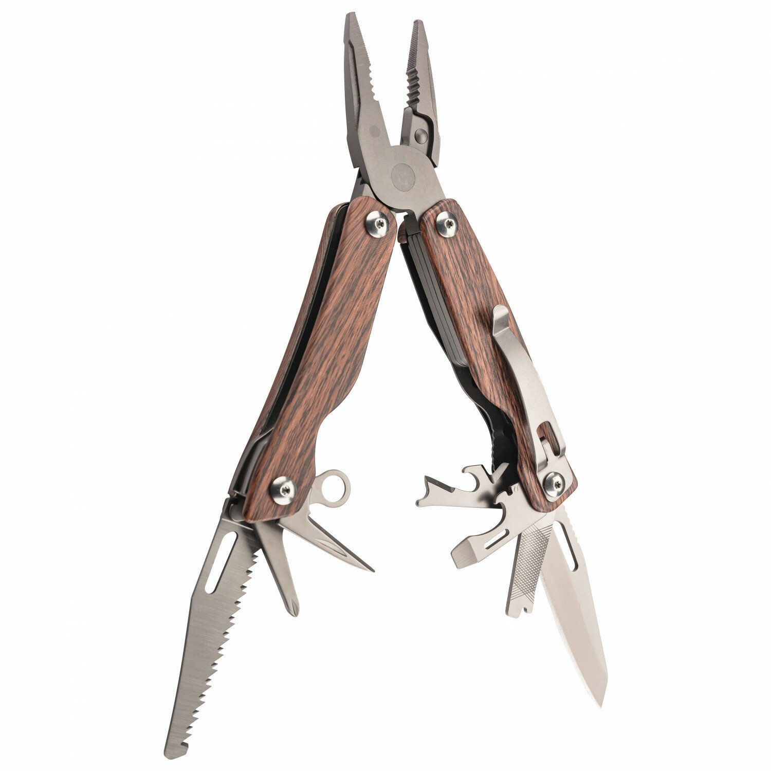 Multifunkčné náradie Herbertz 106700 Holzoptik sa odporúča na použitie v prírode na prežitie, bushcraft, turistiku a pod. S titánovým povrchom a plastovou rukoväťou so vzhľadom dreva.