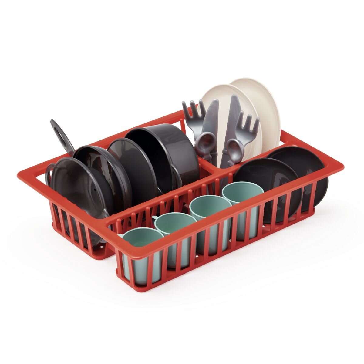 Odkapávač se sadou nádobí obsahuje talířky, příbory, šálky a kuchyňské nádobí. Rozměry odkapávače: 25x18,5x9,5 cm. Vše plastové. prečítať celé