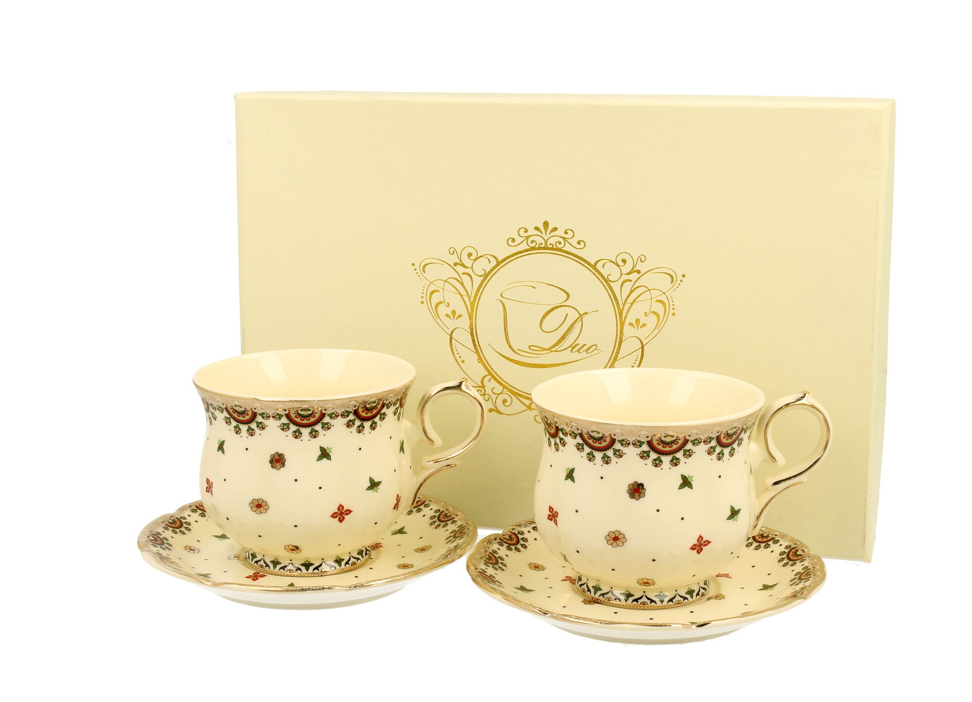 Komplet dwóch filiżanek do espresso w kształcie baryłki CASABLANCA wchodzący w skład kolekcji ECRU. Wykonany z najwyższej jakości porcelany w kolorze śmietankowym wykończonej złotymi zdobieniami oraz delikatnym symetrycznymi kwiatuszkami. Klasyczna stylistyka zadowoli najbardziej wymagające...