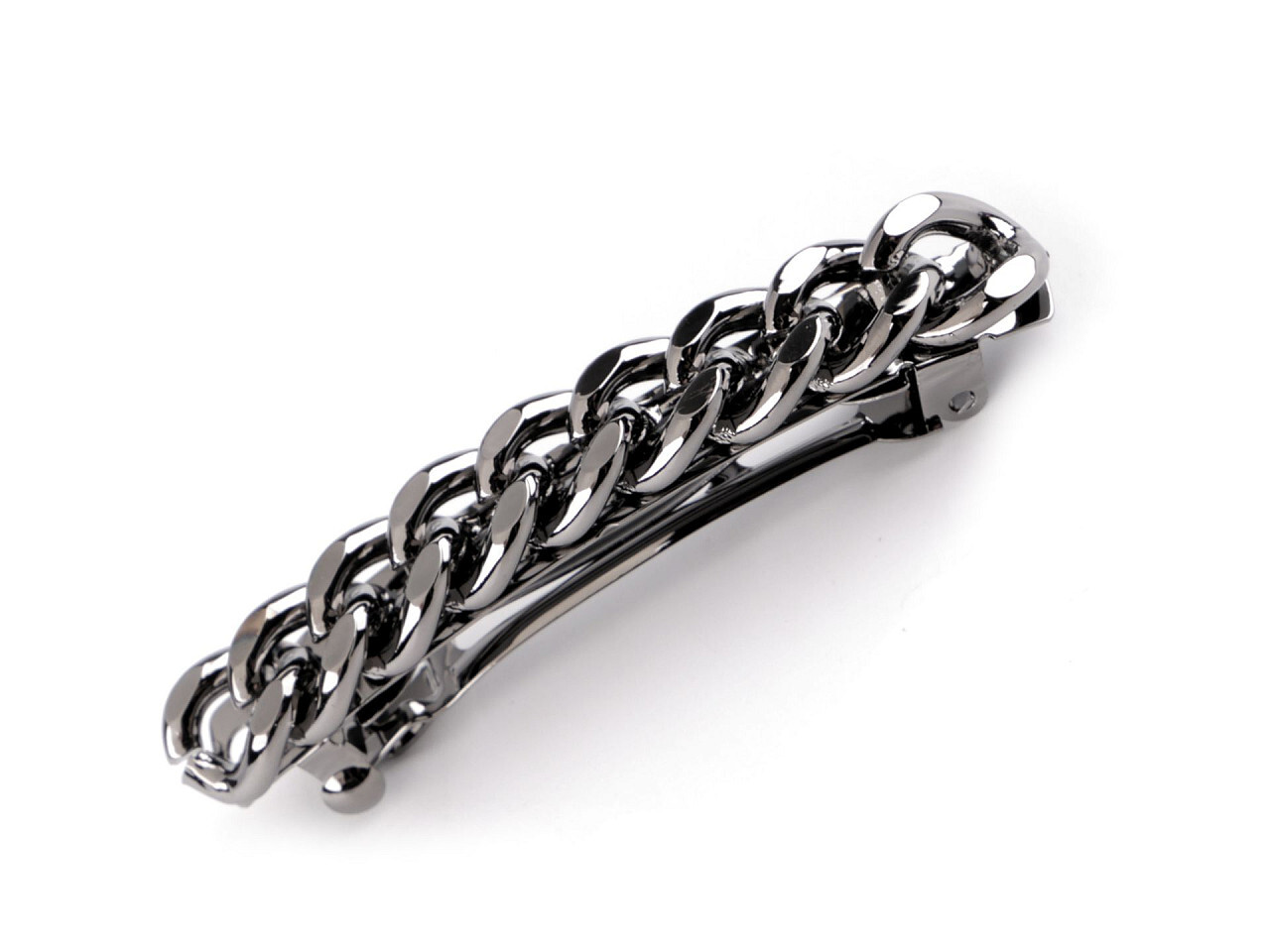 Francouzská spona ozdobená řetězem má velmi kvalitní celokovové provedení. Je lesklá, což z ní činí perfektní volbu pro slavnostní příležitosti i každodenní nošení. Vašemu účesu dodá nevšední nádech a originalitu. Zacvakávací mechanismus zapínání je pevný a spolehlivý, spona udrží vaše vlasy dokonale na svém místě po celý den.