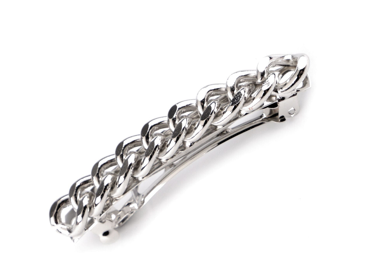 Francouzská spona ozdobená řetězem má velmi kvalitní celokovové provedení. Je lesklá, což z ní činí perfektní volbu pro slavnostní příležitosti i každodenní nošení. Vašemu účesu dodá nevšední nádech a originalitu. Zacvakávací mechanismus zapínání je pevný a spolehlivý, spona udrží vaše vlasy dokonale na svém místě po celý den.