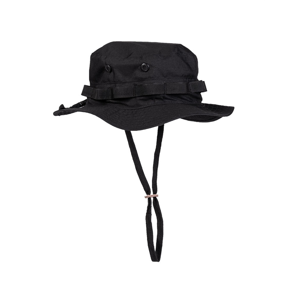 Klobouk ve stylu US GI Boonie od německé značky Mil-Tec. Obvod klobouku lze upravit libovolně pomocí stahovací šňůrky. Má také všestranný popruh po obvodu klobouku pro připevnění dodatečného maskování a také nastavitelný podbradník na stahování pomocí kožené spony. Výhodou jsou také větrací otvory po stranách. Universální velikost.