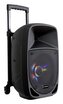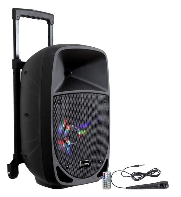 10" přenosný párty bateriový systém s LED osvětlením reproduktoru. Obsahuje vestavěný 4,4Ah akumulátor s výdrží cca 4 hod. Obsahuje 1x ruční kabelový mikrofon, 1x MIC vstup (Jack6,3), 1x AUX vstup (jack3,5). Má vestavěný FM tuner a MP3 přehrávač s USB konektorem, slotem pro SD kartu, LED...