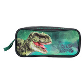 Jednoduchý dvoukomorový školní penál Dino World, Detail hlavy T-Rexe, zelená mračna v pozadí