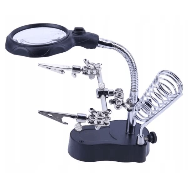 Tento robustný držiak ponúka dve lupy s rozdielnym zväčšením, aby ste si vždy mohli vybrať ideálny optický uhol podľa potreby. Veľká lupa s priemerom 65 mm so zväčšením 3,5x poskytuje široký a jasný obraz, zatiaľ čo menšia lupa 17 mm so zväčšením 12x umožní skúmať tie najmenšie detaily. Silné krokosvorky spoľahlivo fixujú materiál, a vy tak môžete pracovať s maximálnou presnosťou bez zbytočného posúvania.