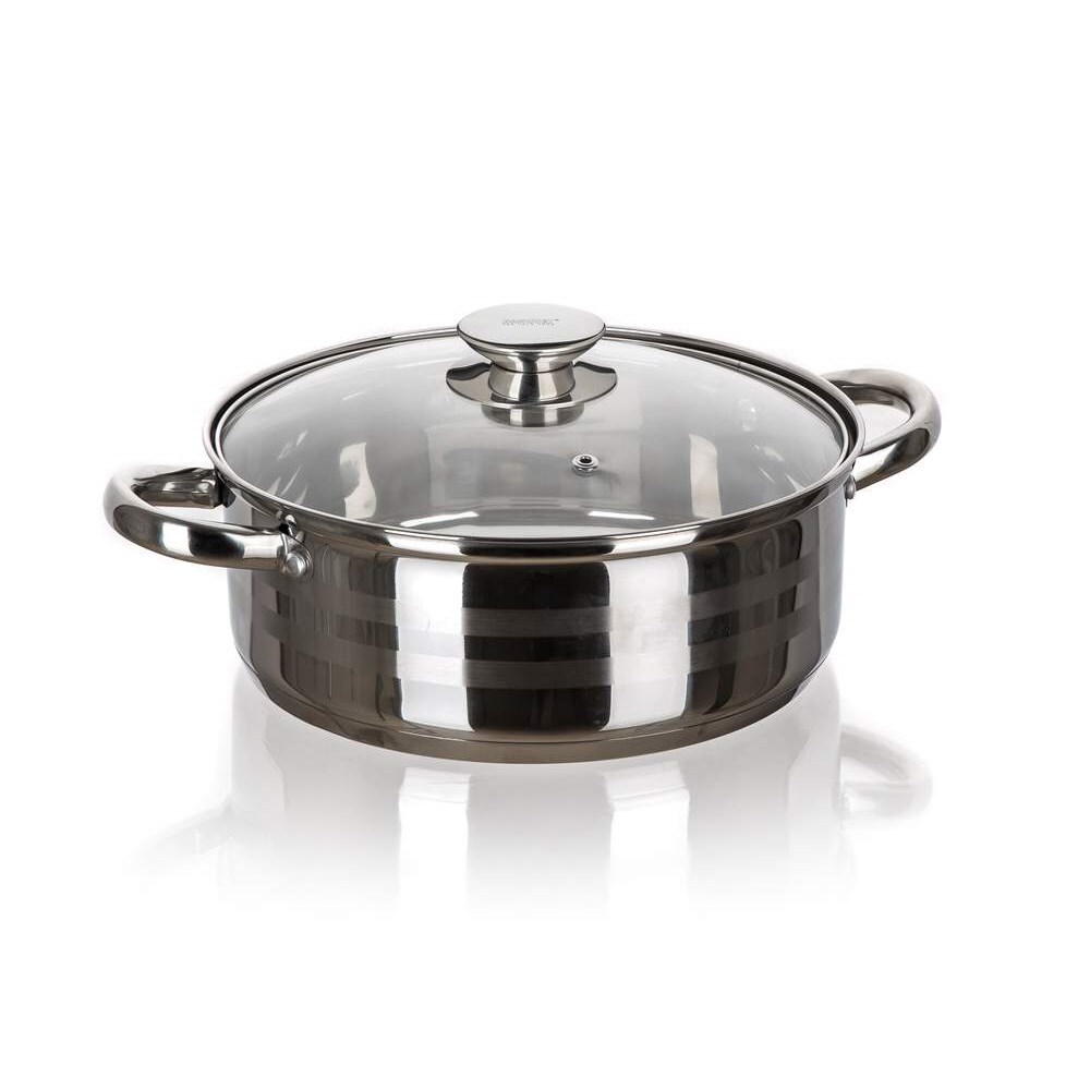 Nerezový kastrol LIVING 3,9 l pro přípravu různých pokrmů jako je polévka, omáčka atd. Má skleněnou poklici, nerezový knob i držadla, lesklý povrch uvnitř i vně a na vnější straně jsou tři matné pruhy. Kastrol lze použít na všechny typy varných desek včetně indukce a je vhodný do myčky na nádobí. Materiál: nerez 201, rozměry: výška kastrolu 9 cm a průměr 24 cm.