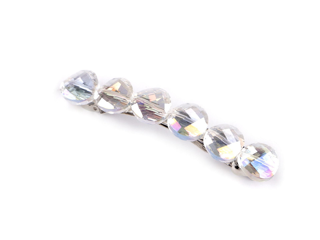 Francouzská spona zdobená akrylátovými broušenými kameny luxusně ozdobí váš účes. Nádherně se leskne a přitahuje pozornost. Ať už máte jemné prameny nebo husté lokny, touto sponou snadno sepnete vlasy do copu nebo vytvoříte elegantní drdol, který bude vypadat, jako kdyby ho vytvořil profesionál. Spona má kvalitní celokovové provedení, zacvakávací mechanismus je pevný. Délka části pro vlasy je 5,5 cm.