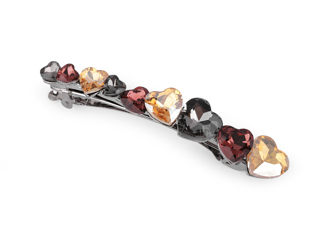 Francouzská spona zdobená akrylátovými broušenými srdci luxusně ozdobí váš účes. Má nádherný lesk, který přitahuje pozornost. Ať už máte jemné prameny nebo husté lokny, touto sponou snadno sepnete vlasy do copu nebo vytvoříte elegantní drdol, který bude vypadat, jako kdyby ho vytvořil profesionál. Spona má kvalitní celokovové provedení, zacvakávací mechanismus je pevný. Délka části pro vlasy je 4,5 cm.