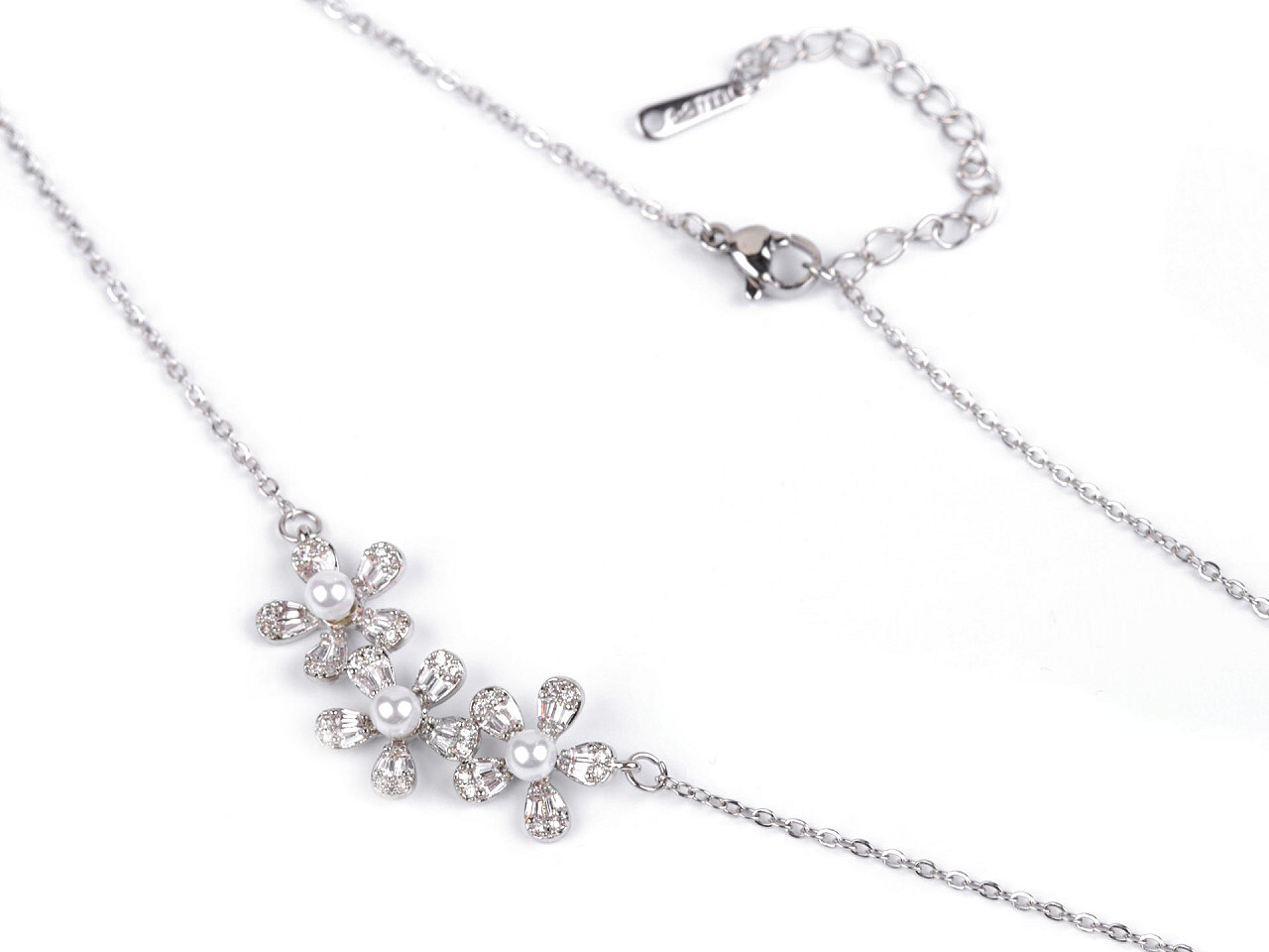 Náhrdelník s květy z kvalitní nerezové oceli efektně doplní váš každodenní i slavnostní outfit. Květy se nádherně třpytí, jsou osázené broušenými kamínky a perlami. Náhrdelník je velice univerzální, hodí se do výstřihů halenek, šatů i k tričkům. Přívěsek je zavěšený na jemném očkovém řetízku.