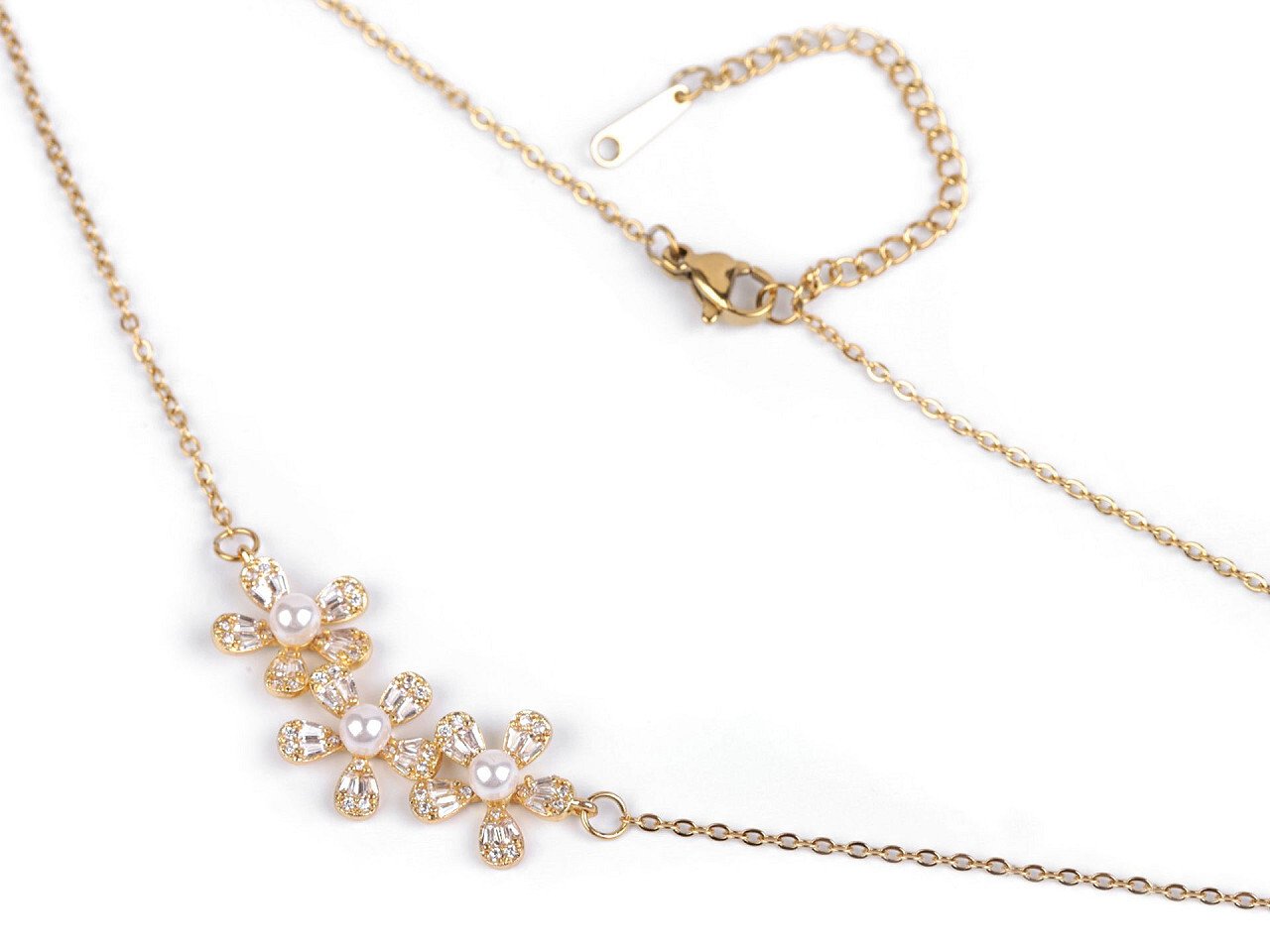 Náhrdelník s květy z kvalitní nerezové oceli efektně doplní váš každodenní i slavnostní outfit. Květy se nádherně třpytí, jsou osázené broušenými kamínky a perlami. Náhrdelník je velice univerzální, hodí se do výstřihů halenek, šatů i k tričkům. Přívěsek je zavěšený na jemném očkovém řetízku.