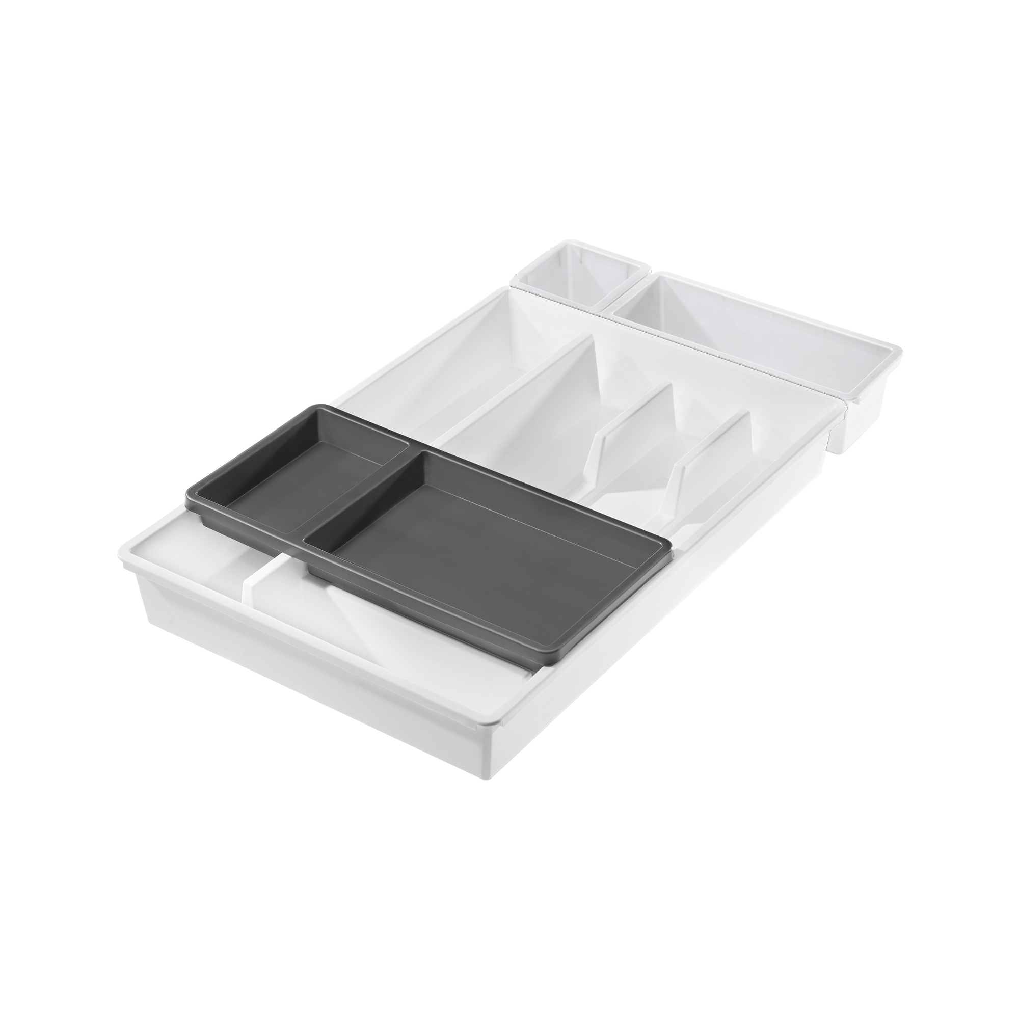 Příborník BELLA - set 4 ks - bílá/grafit;29X49.2XH6.7CM;objem:Tento příborník Bella se hodí do všech kuchyňských zásuvek o rozměrech 40x60 a má praktickou posuvnou horní přihrádku a dvě přídavné nádoby, které jsou ideální pro uložení malých předmětů. prečítať celé