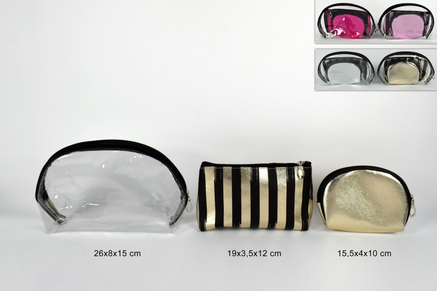 Průhledná taška má rozměr 26 x 8 x 15 cm, střední taštička s pruhy má rozměr 19 x 3,5 x 12 cm a nejmenší celozlatá má rozměr 15,5 x 4 x 10 cm.