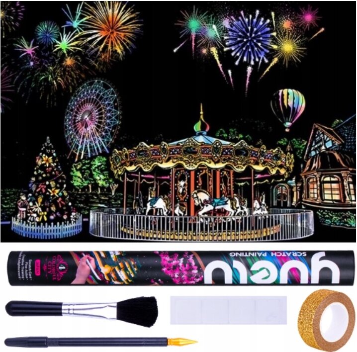 Škrabací obrázek s motivem zábavního parku. Obsah balení: škrabací obrázek 75x52 cm štětec škrabací nástroj barevnou lepicí pásku nano lepící body k uchycení obrázku na zeď prečítať celé