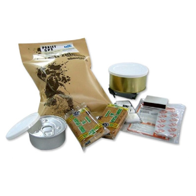 Obsah balení střeleckého potravinového balíčku Esbit podložka na ohřívání tuhé palivo Esbit 6 kusů držák na plechovku bonbón s extraktem z kávy bonbón s vitamínem C žvýkačka 1 ks tabletka na desinfekci vody, vak na desinfekci vody 25 g čokolády na pití cukr instantní nápoj z ovoce a...