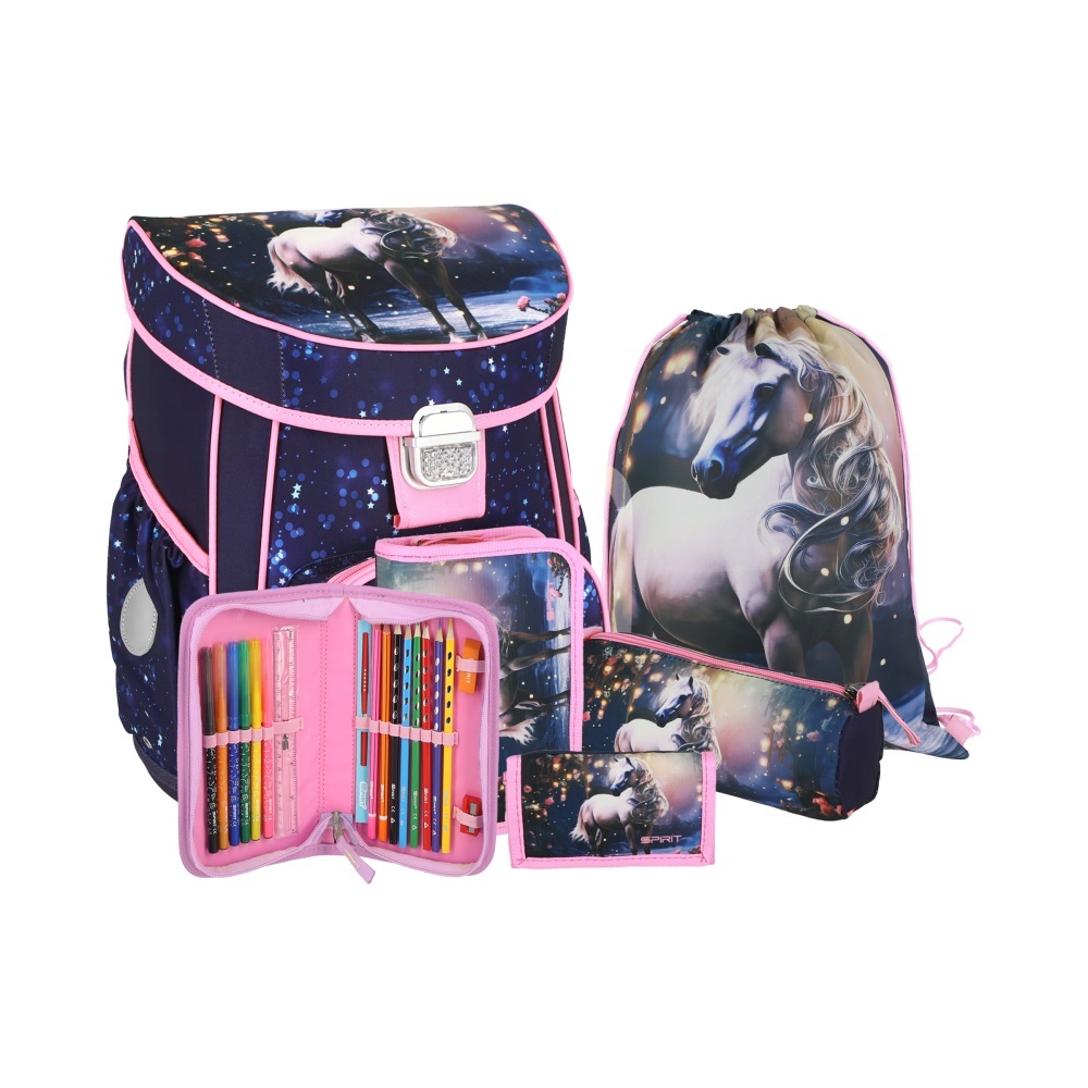 Sada obsahuje: školskú tašku, vrecko na prezúvky, naplnený peračník, okrúhle puzdro a peňaženku.Kvalitná, pevná taška vhodná pre deti na 1. stupni ZŠ.Vlastnosti:priedušný, anatomicky tvarovaný a vystužený chrbát "Spirit Ergo & Air Flow System" nastaviteľné ramenné popruhy v tvare S so silným...
