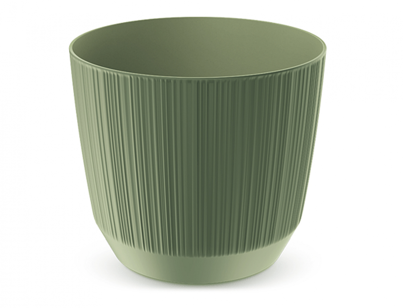 Plastový, matný obal na květináč s podélnými drážkami po celém obvodu a hladkým pruhem v oblasti dna. Zajímavý, hravý design rozbije monotónnost v jakémkoliv prostoru. Kruhového půdorysu. 100% recyklovatelný (plast, žlutý kontejner). Vhodné do interiéru i exteriéru. UV stabilní. Rozměry: průměr 17cm, výška 15cm. Barva: zelená.