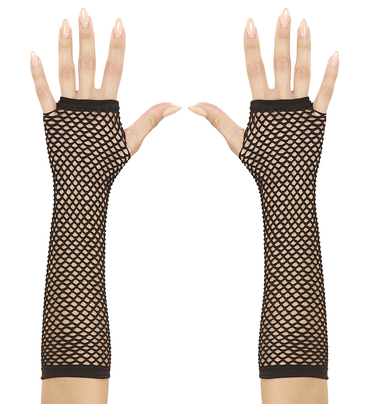 Černé rukavičky, síťované, bez prstů. Délka: 33 cm Materiál: 90% nylon, 10% elastan Velikost: dospělá, univerzální prečítať celé