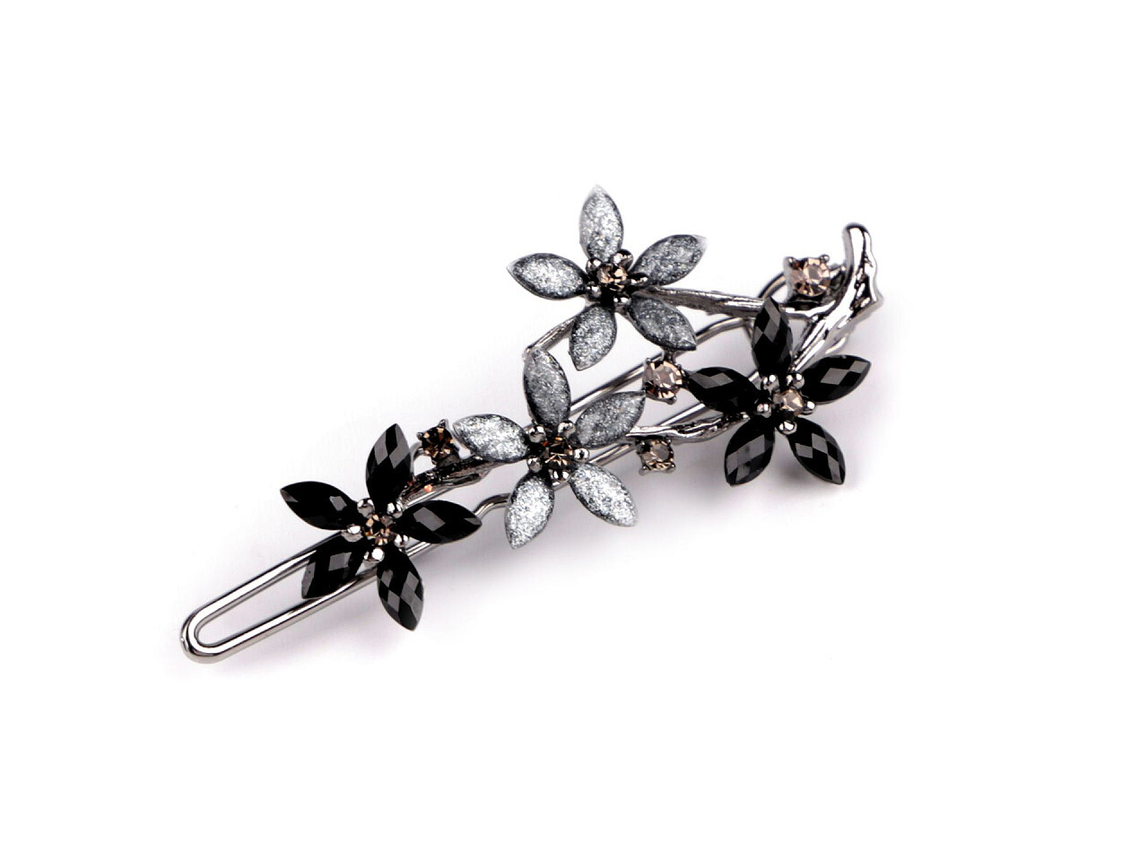 Elegantní sponku do vlasů zdobí květy s broušenými kamínky. Je vyrobená z kvalitního bižuterního kovu, na zadní straně má malé zoubky, ve vlasech dobře drží. Využijete ji na různé společenské akce, ale také na běžné nošení, zajímavě ozdobí váš účes.