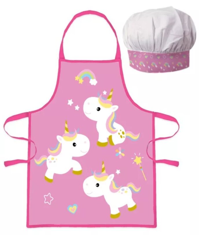 Dětská zástěra UNICORN - JEDNOROŽEC růžový set s čepicí