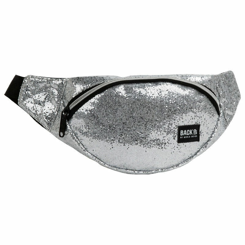 Srebrna nerka z cekinowego metalicznego materiału. Jedna kieszeń z przodu i ukryta kieszeń z tyłu. Wnętrze:torba na biodra z oryginalnego materiału-2 kieszenie na zamek (jedna schowana z tyłu)-pasek z możliwością regulacji-rozmiar 25x15x4cm waga: 90gWymiary opakowania: 39 x 17,5 x 2,5 cm