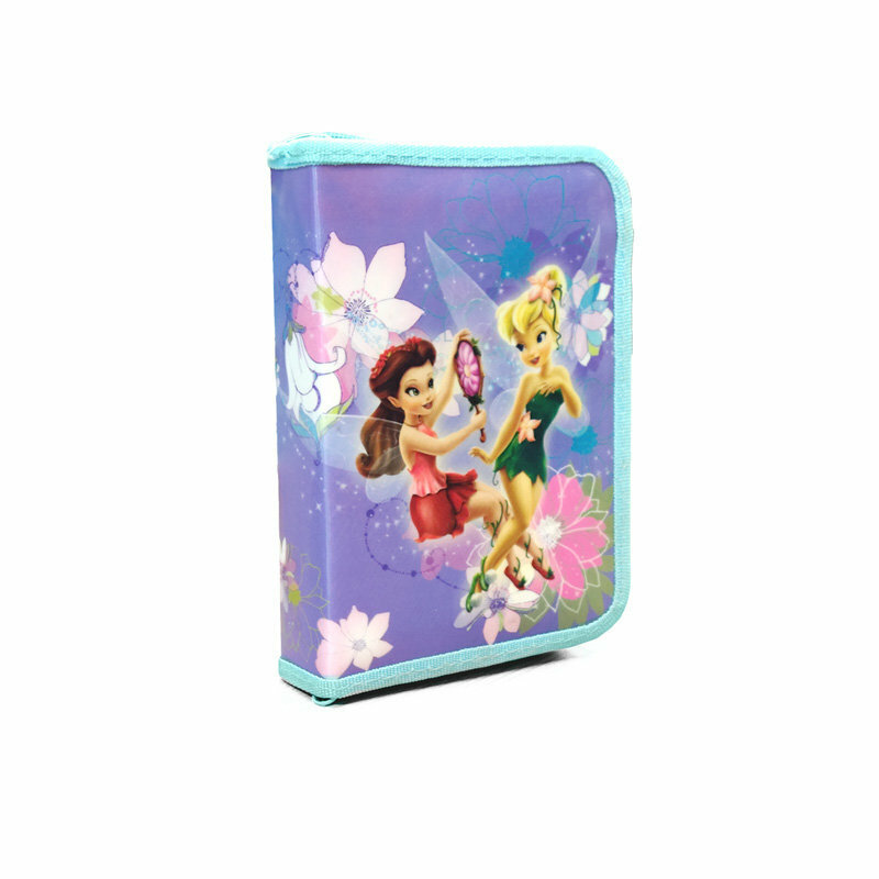 Piórnik z dwoma skrzydłami (wzór graficzny - wróżki). W środku znajduje się kompletne wyposażenie (flamastry, długopis, linijka, gumka, temperówka, ołówek, kredki i plan lekcji). Produkt posiada licencję Dinseya (Dzwoneczek). Został wykonany w dźwięczących kolorach.Wymiary opakowania: 48x20x1cm