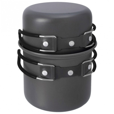 Outdoorové hrnce trekking biwak Velmi lehká sada hrnců z tvrdě eloxovaného hliníku. Robustní skládací rukojeti zajišťují bezpečné držení při jakékoli úrovni naplnění. Přeprava probíhá v praktické síťové tašce, která je součástí balení. Sada pro 1 - 2 osoby 216 g malý hrnec Ø 12 x 6 cm, 500 ml...