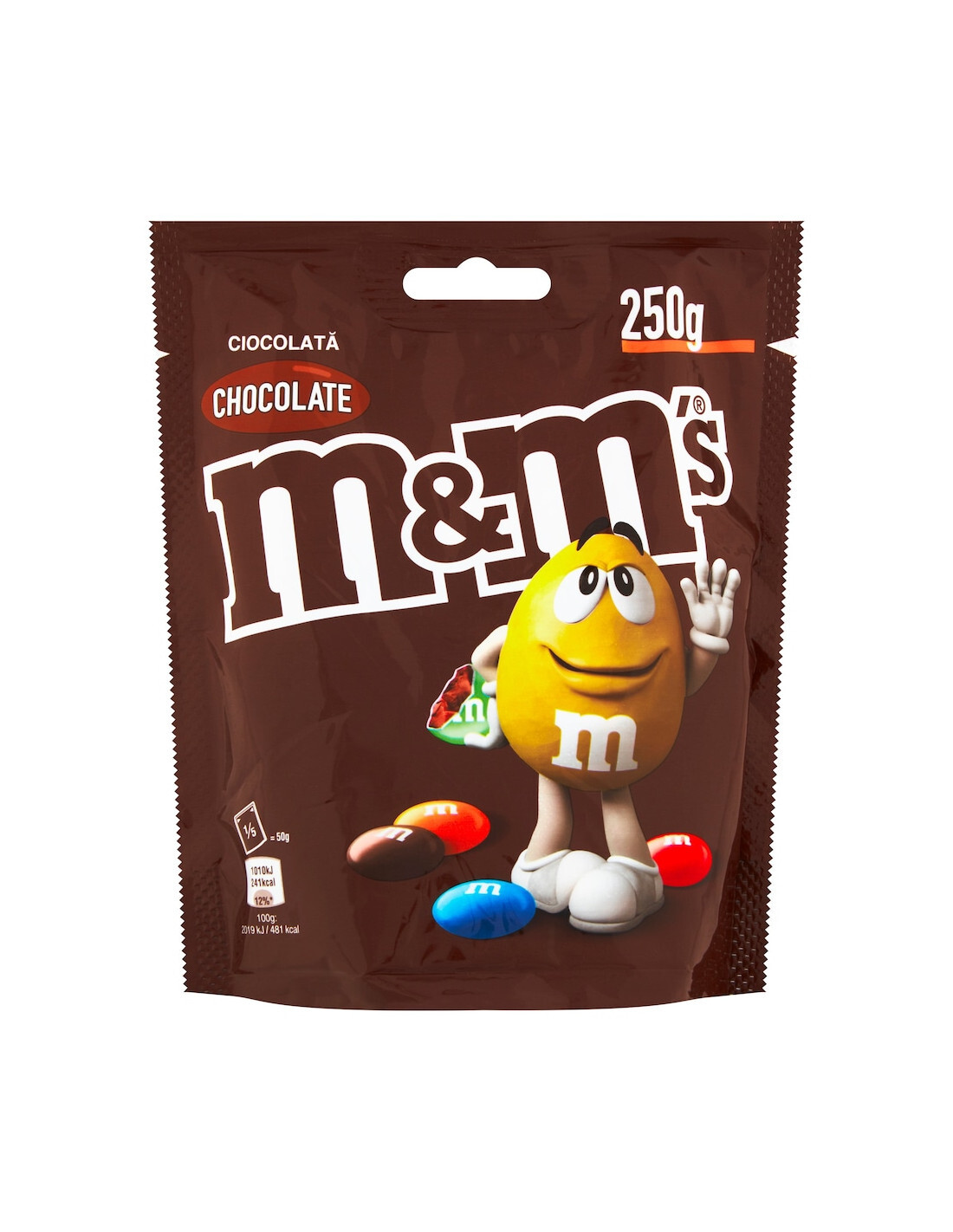 Čokoládové dražé - mléčná čokoláda (68%) v pestrobarevné polevě.Složení: cukr, Kakaová hmota, Sušené odtučněné mléko, Kakaové máslo,Sušená syrovátka permeát (mléko), Škrob,mléčný tuk, palmový tuk, bambucký tuk, Glukózový sirup, Barviva*, Emulgátor (sójový lecitin), Dextrin, Leštící látka...