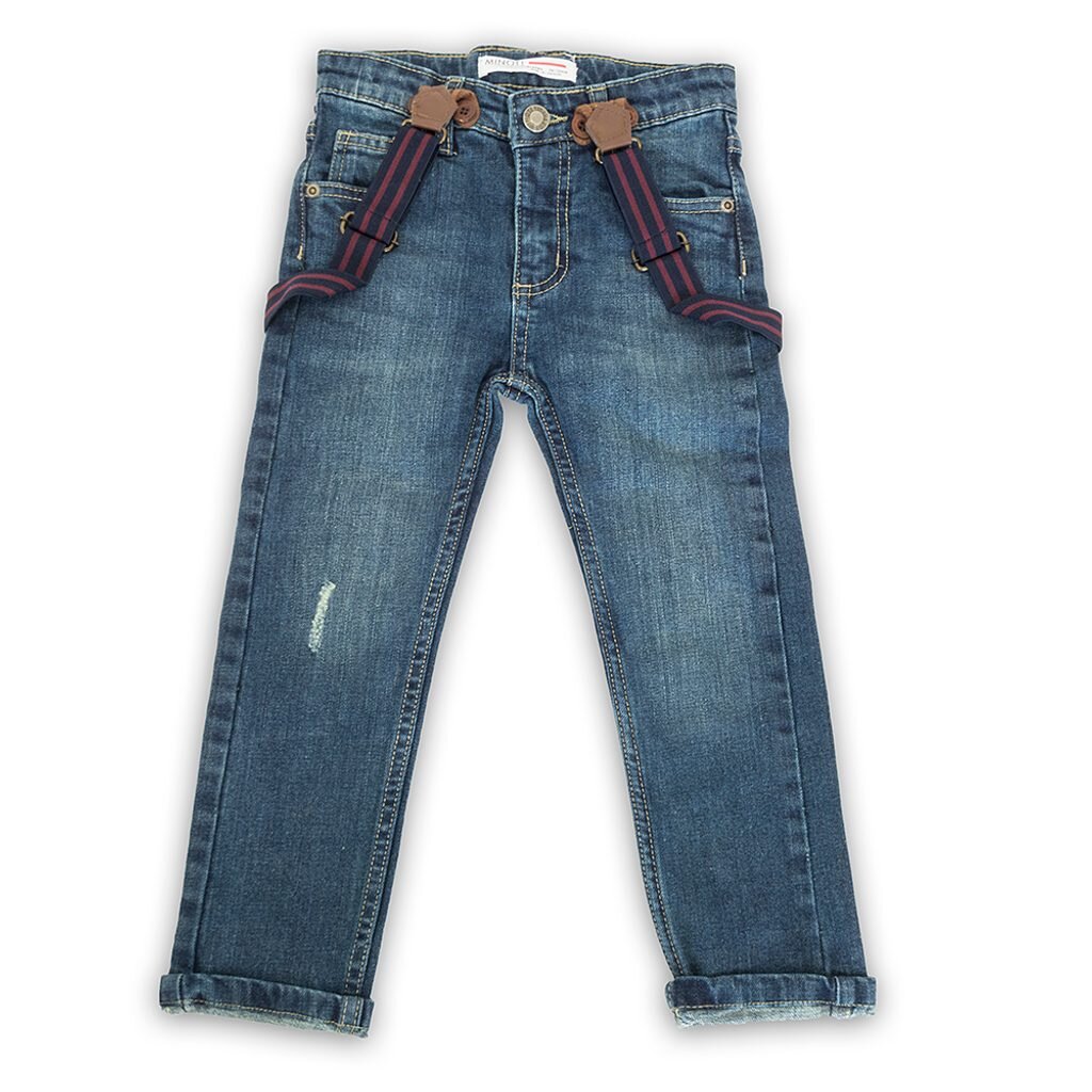 Dětské riflové kalhoty se šlemi. Kalhoty mají klasické zapínání na knoflík a zip, dvě zadní a dvě boční kapsy. prečítať celé