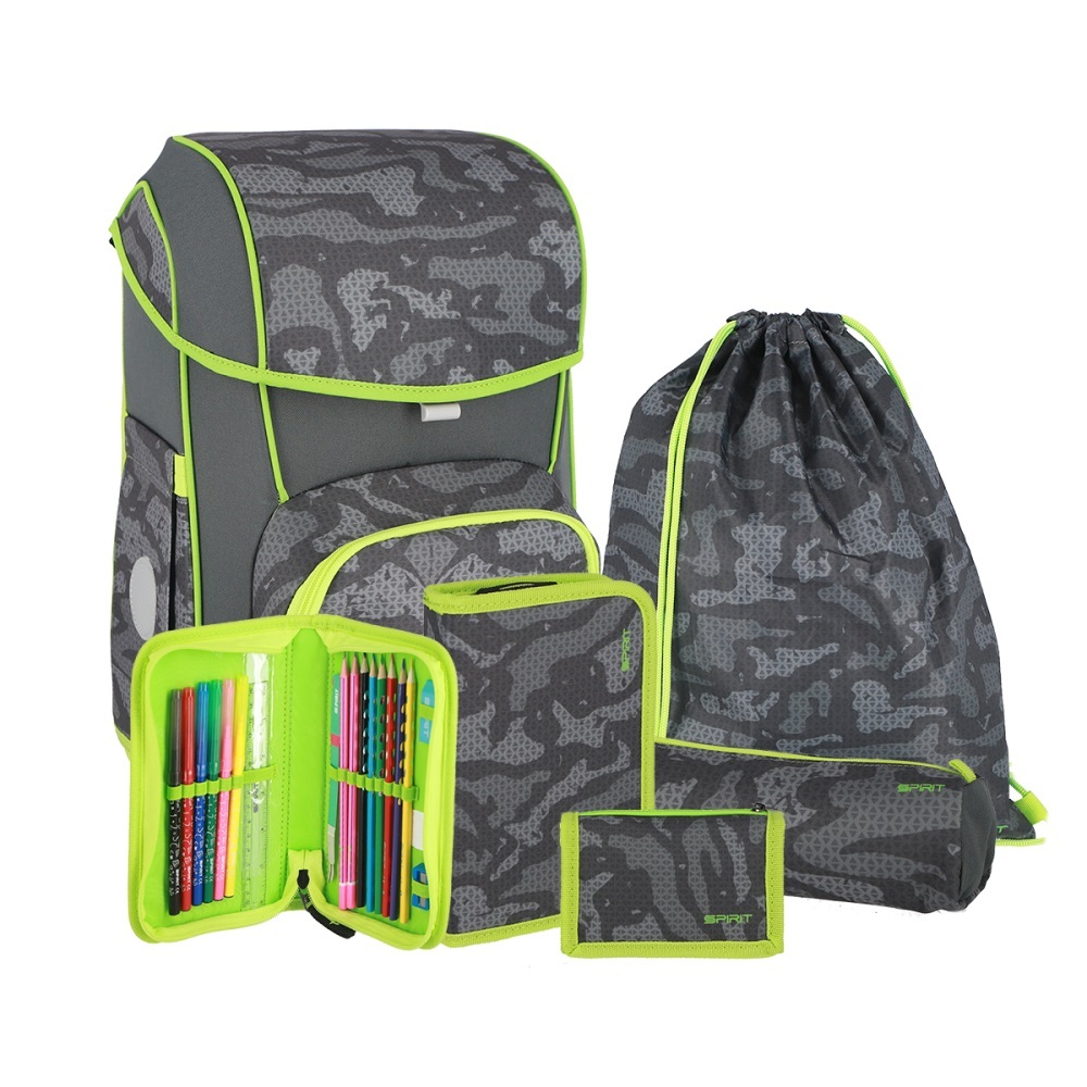 Sada obsahuje: školskú tašku, vrecko na prezúvky, naplnený peračník, okrúhle puzdro, peňaženku a nášivku na suchý zips s dizajnom na ozdobenie tašky.Kvalitná, pevná taška vhodná pre deti na 1. stupni ZŠ.Vlastnosti:priedušný, anatomicky tvarovaný a vystužený chrbát "Spirit Ergo & Air Flow System"...