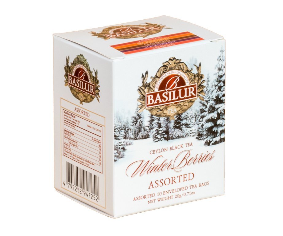 Variace černých čajů aromatizovaná, porcovaná Složení: RASPBERRIES - černý čaj, přírodní aroma (malina), SEA BUCKTHORN - černý čaj, přírodní aroma (rakytník), CRANBERRIES - černý čaj, přírodní aroma (brusinka), BLACKCURRANT - černý čaj, přírodní aroma (černý rybíz), BARBERRIES - černý čaj,...