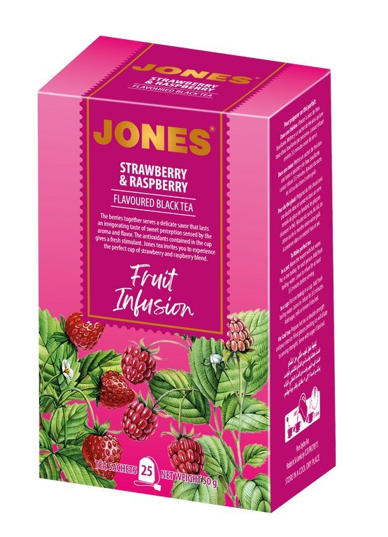 Černý čaj, ochucený, aromatizovaný, porcovanýSložení: černý čaj 74 %, ibišek květ 20 %, aroma (jahoda, malina, kyselina citronová) Hmotnost: 50g (25x2g) Návod na přípravu: 1 sáček na šálek, zalít vodou 100°C, louhovat 3-5 minut. Výrobce: A. F. JONES (EXPORTERS) CEYLON LTD. Baleno na Srí Lance. Dovozce pro ČR: MIX-TEE velkoobchod, s.r.o., Masarykova 235, 250 88 Čelákovice, Česká republika Skladovat v suchu a chladu.