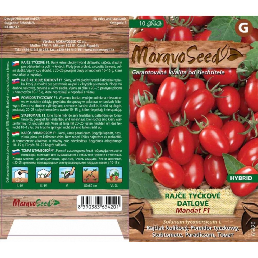 Rajče tyčkovéSolanum lycopersicum L.MANDAT F1Raný, velmi plodný hybrid datlového rajčete, vhodný pro pěstování na poli i v krytech. Plody jsou drobné, válcovité, červené, velmi sladké. Vijany jsou dlouhé, s 20-25 pevnými plody o hmotnosti 10-15g, které nepraskají a nepadají.Obsah:10...