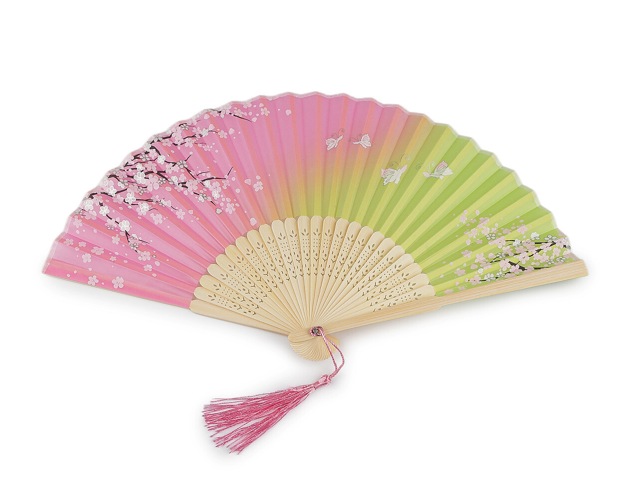 Vějíř textilní s metalickými detaily - 1 ks - 4 růžová sv. stříbrná