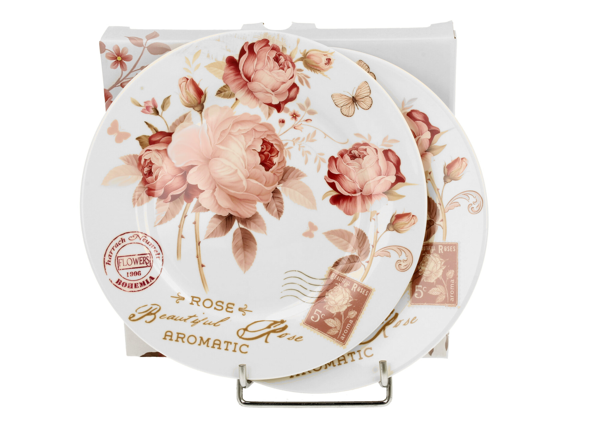Komplet dwóch talerzy deserowych SECESJA wchodzący w skład serii Kwiaty Classic, wykonany z porcelany New Bone China, charakteryzującej się elegancką i naturalną kremowo - białą barwą z delikatnym połyskiem, a także wyjątkową wytrzymałością.Linia zdobiona motywem różanych kwiatów oraz znaczków...