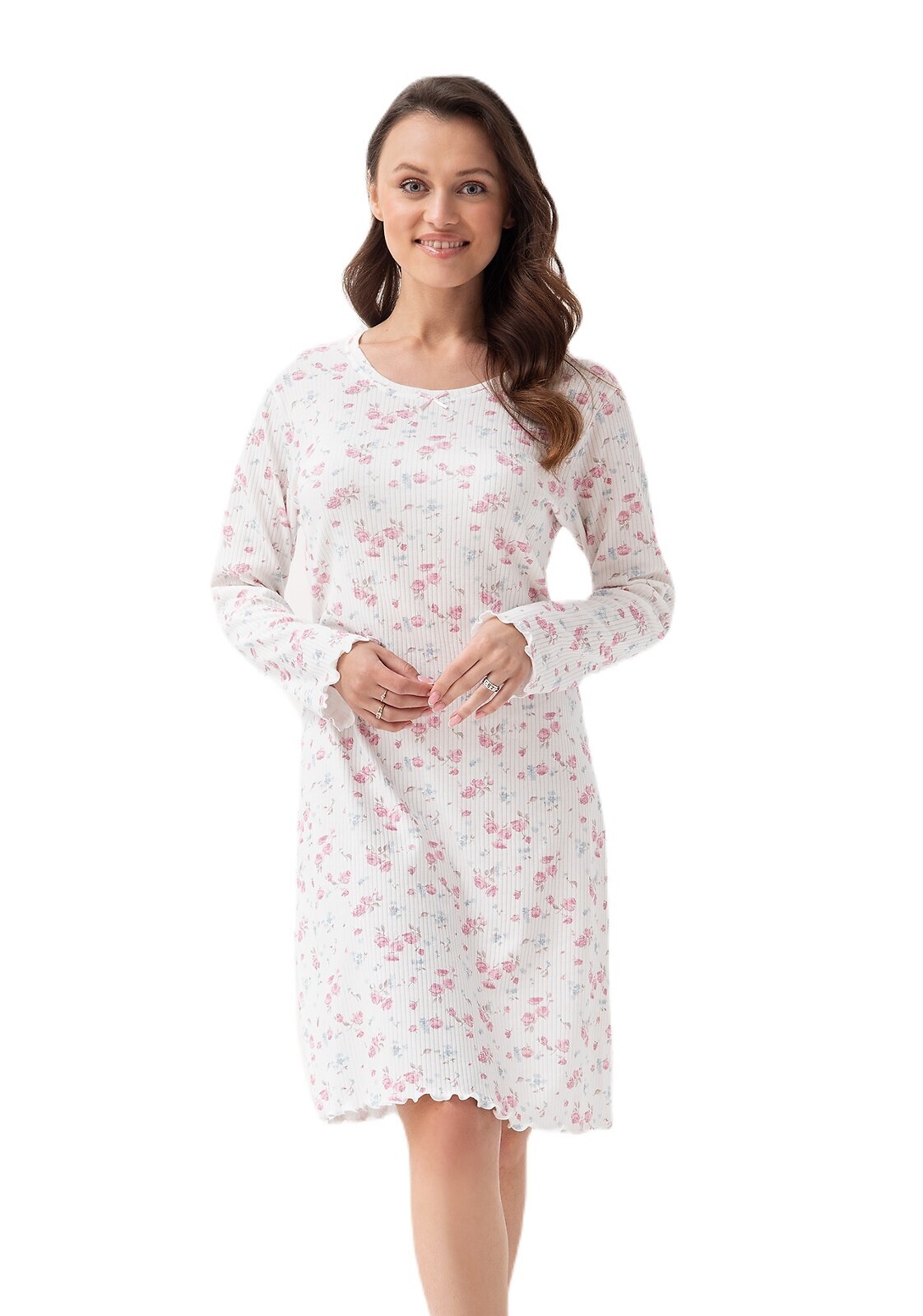 Koszula nocna damska- z miękkiej bawełny w delikatny prążęk- długi rękaw- w kwiatowy nadruk- dekolt półokrągły, zdobiony kokardką- dół koszuli zakończony falbanką (mereżką)- długość przed kolano prečítať celé
