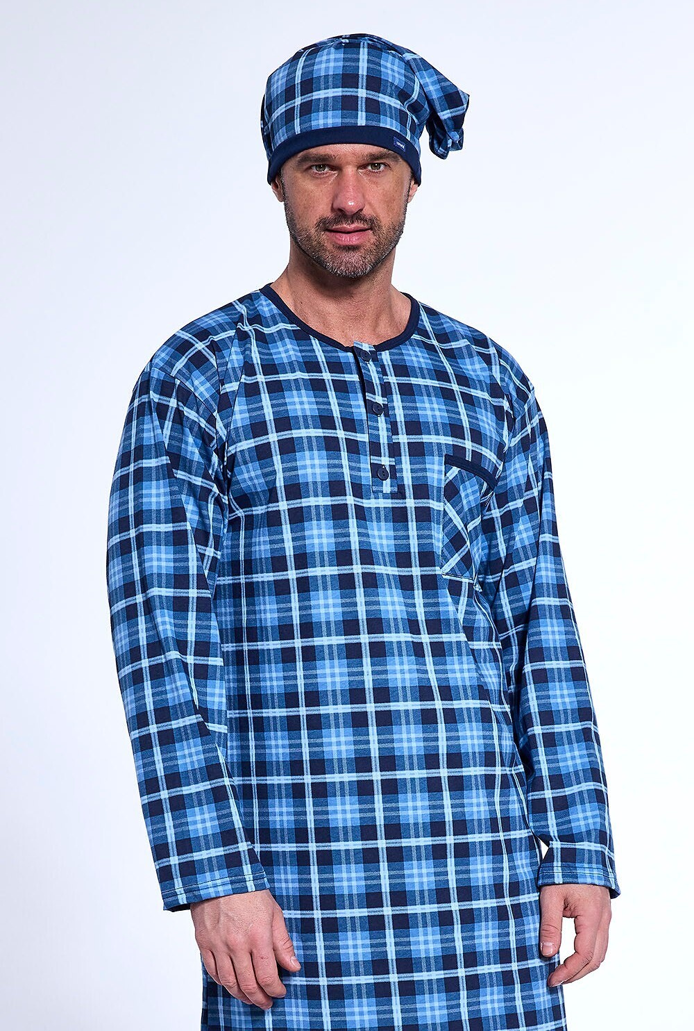 Koszula nocna, męska- bawełna w kratę- długi rękaw- dekolt zapinany na guziki- na wysokości klatki piersiowej mała kieszonka- do kompletu szlafmycaSkład: 100% bawełna prečítať celé