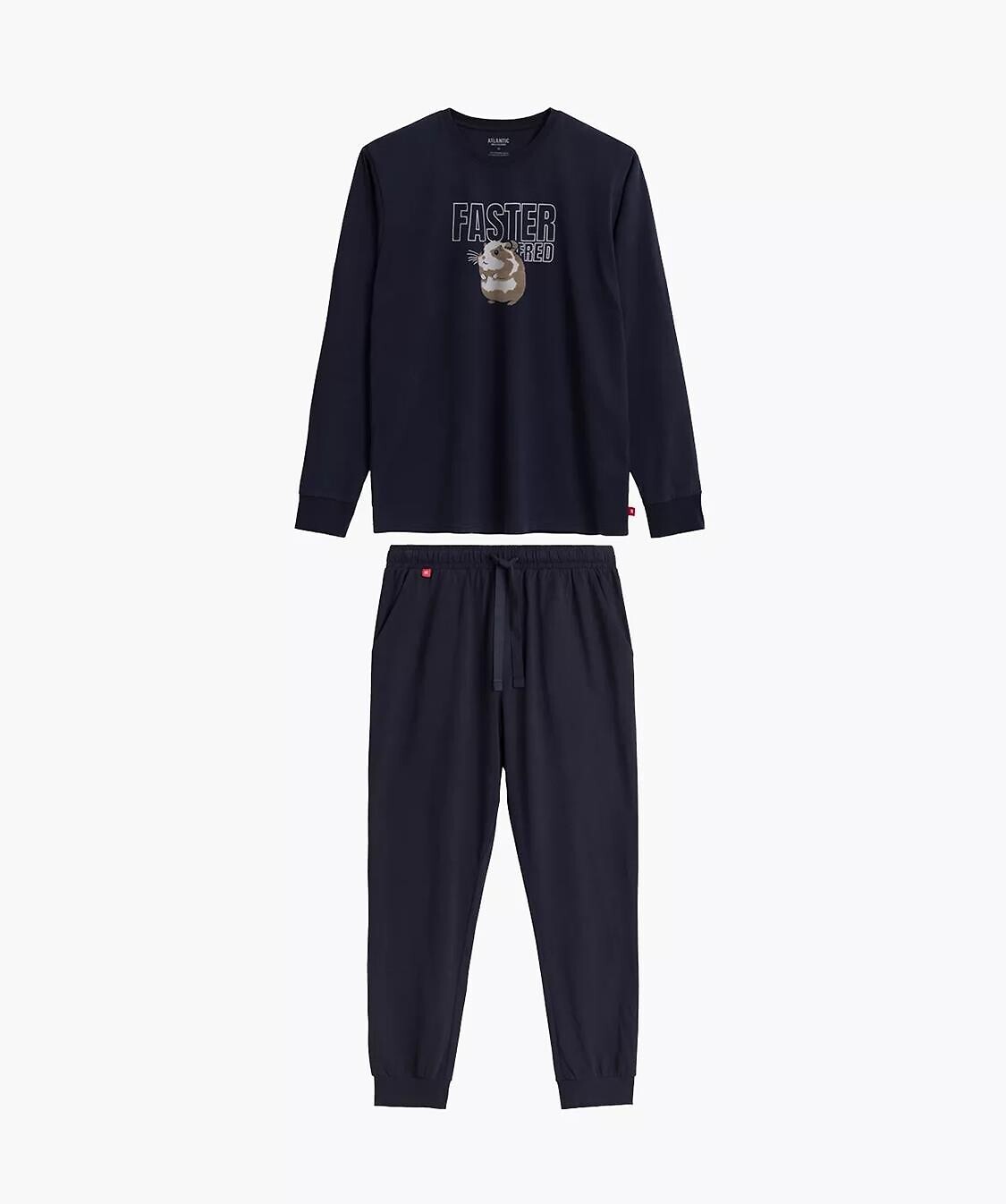 Piżama męska, z zabawnym, sporych rozmiarów chomikiem na przodzie- miękkość bez granic i 100% swobody ruchów- długi rękaw- miękka i przytulna w dotyku dzianina- spodnie klasyczne- sznurek do regulacji w pasie- boczne kieszenie- nogawki zakończone ściągaczami