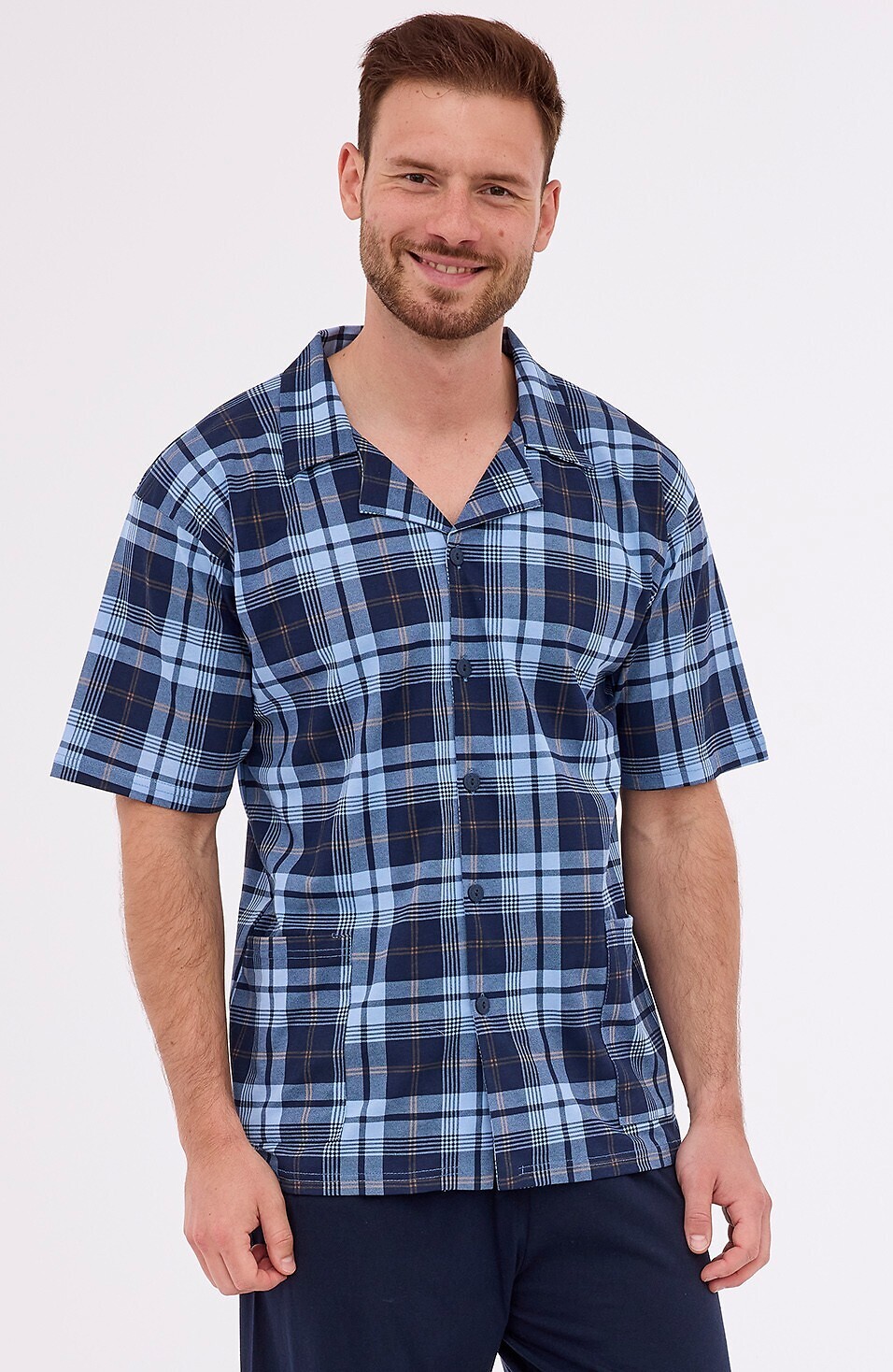 Piżama męska, rozpinana- wysoka jakość bawełny- bluza w kratkę, z krótkim rękawem- z kołnierzykiem, zapinana na guziki, z kieszeniami- spodnie długie, jednolite prečítať celé