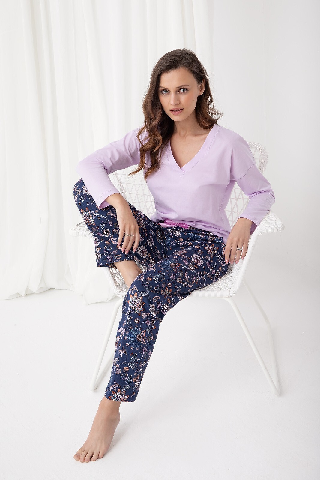 Bawełniana piżama damska- koszulka jednolita z długim rękawem- dekolt w kształcie litery "V"- długie spodnie z efektownym kwiatowym printem- w pasie satynowa kokardka- na biodrach wygodne kieszenie prečítať celé