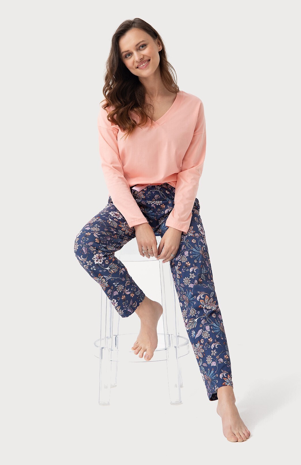 Bawełniana piżama damska- koszulka jednolita z długim rękawem- dekolt w kształcie litery "V"- długie spodnie z efektownym kwiatowym printem- w pasie satynowa kokardka- na biodrach wygodne kieszenie prečítať celé